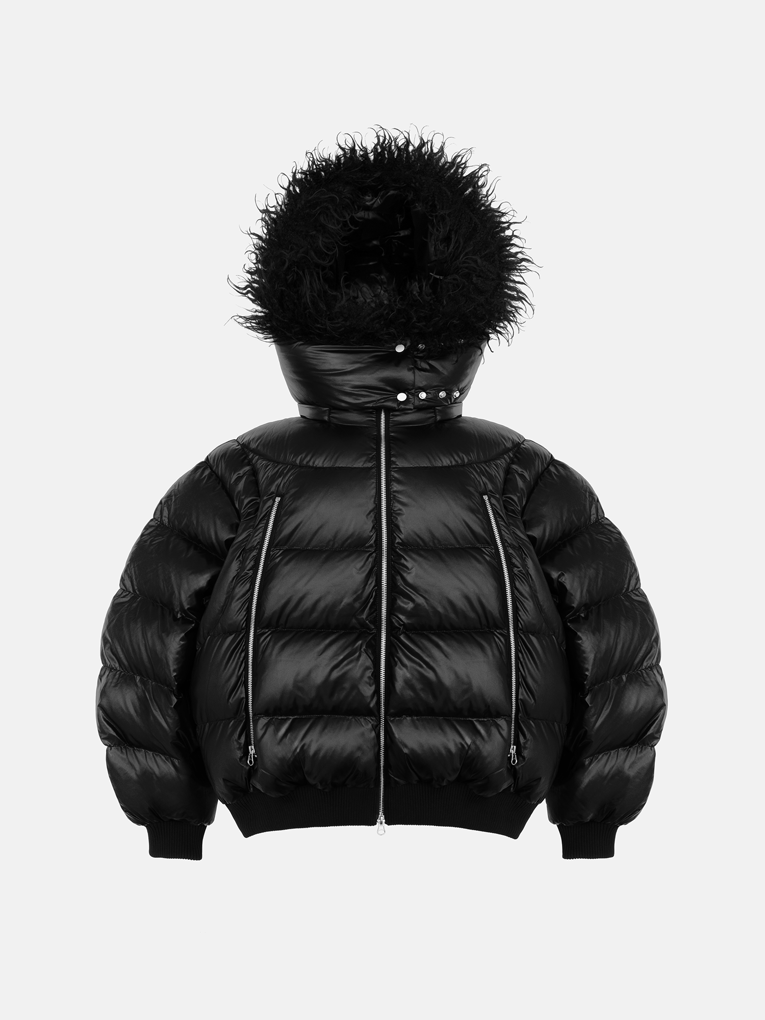 - BLACK FUR HOOD WITH SNAP BUTTONS CLOSURE, DETACHABLE WITH HIDDEN ZIPPER