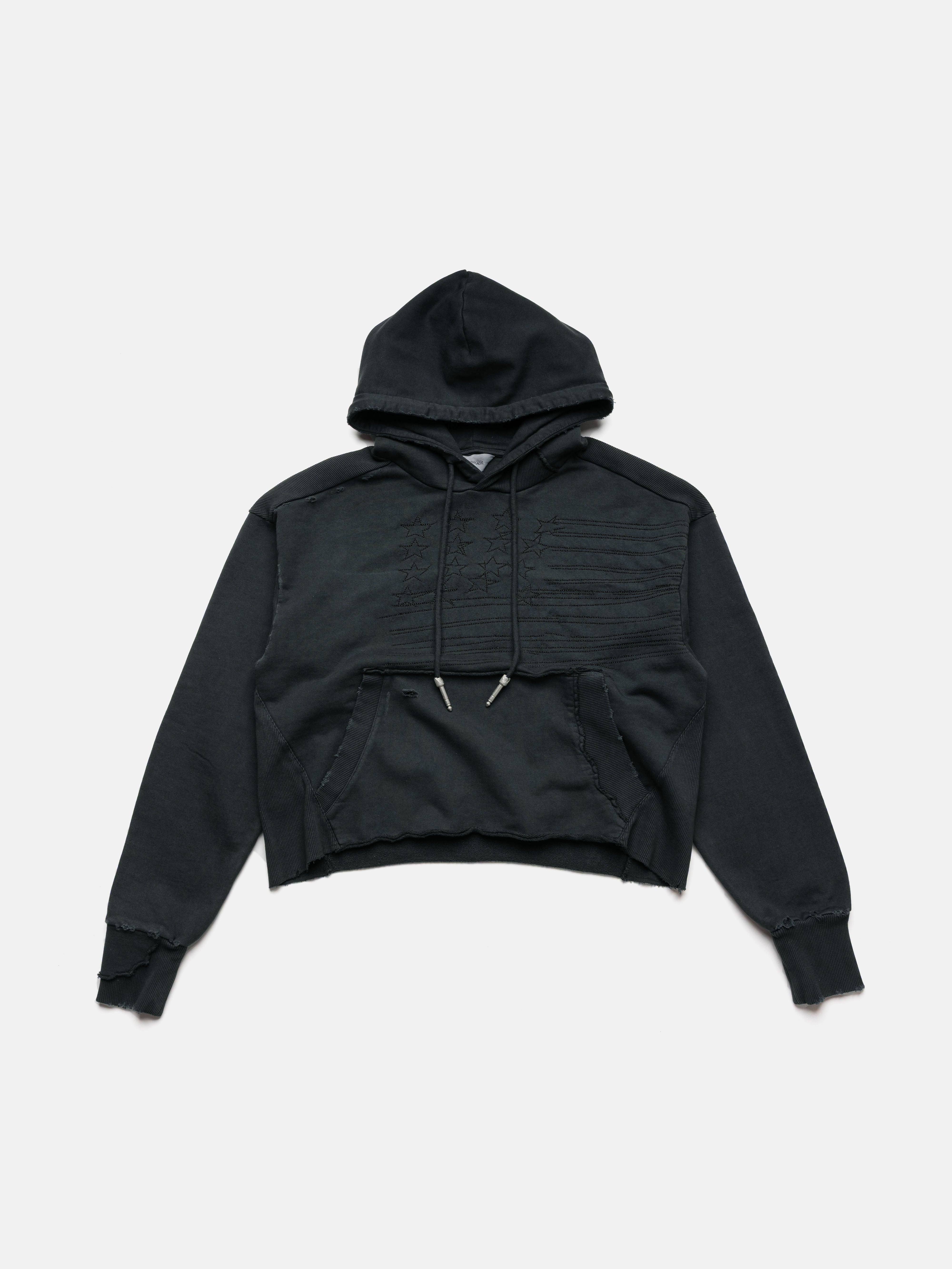 Part of the Spring 26 collection — iDosing. A cropped-hem hoodie silhouette deconstructed with ribbed body panels. Distressed throughout and garment-dyed to achieve an authentic vintage, faded look. The style features multi-thread embroidery of an American flag and Spring 26 custom metal audio hardware.